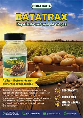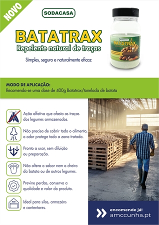 Batatrax é a solução inovadora para o controlo pós-colheita: afasta traças e regula a humidade em batatas, cebolas, milho e outros legumes armazenados. Prolonga a conservação, atrasando o aparecimento de grelos, reduzindo perdas e garantindo maior segurança e qualidade no armazenamento.