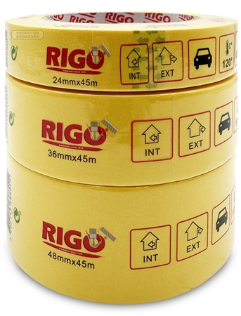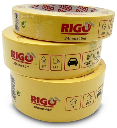 RIGO Fita de Pintura PRO 120º — Ideal para criar linhas retas e bem definidas em superfícies delicadas. Resistente até 120?°C. Disponível em 3 tamanhos.